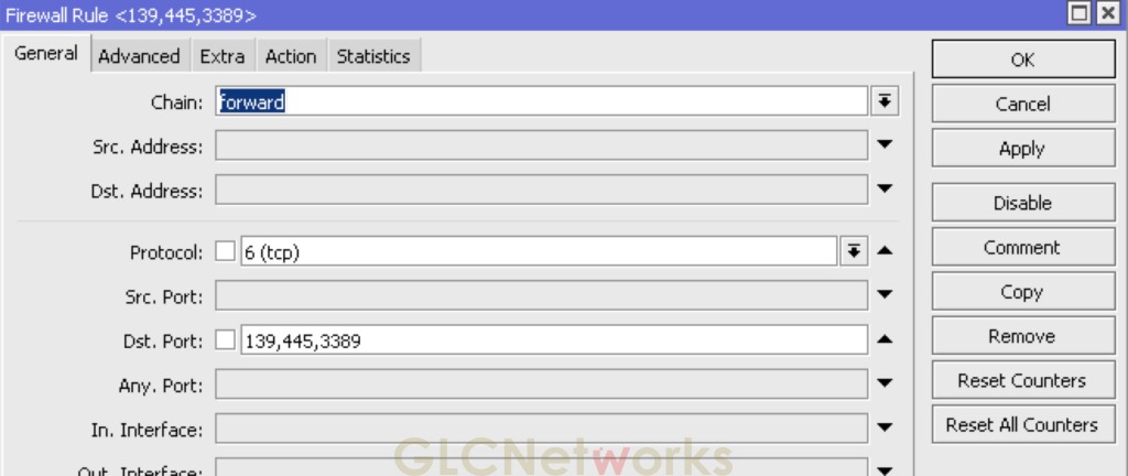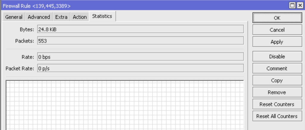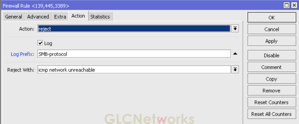 pada tab action ini, kita mengaktifkan fasilitas log. sehingga ketika traffic yang terkait dengan protocol SMB / RDP yang melewati router, akan dimunculkan pada log.