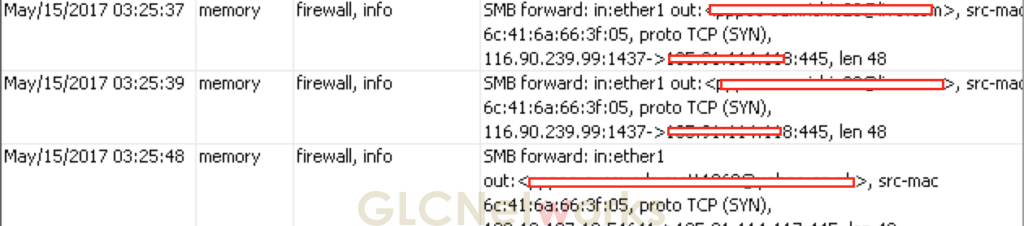 apakah saya dapat mengetahui komputer mana saja yang kemungkinan telah terinfeksi oleh ransomware? hal ini dapat dilakukan, langsung saja cek log mikrotik (seperti pada gambar poin 4 diatas), kemudian lihat ip address yang mengakses port smb/rdp. perlu diingat, ini adalah kemungkinan saja, bisa jadi komputer tersebut mengakses port smb/rdp dengan disengaja oleh admin.